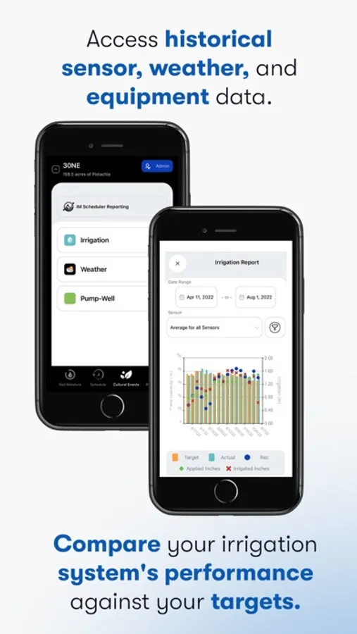 Reporting - Access historical sensor, weather, and equipment data such as pumping efficiency, pumping levels, flow meter data, etc. from all your technology and compare your irrigation system's performance against your target.