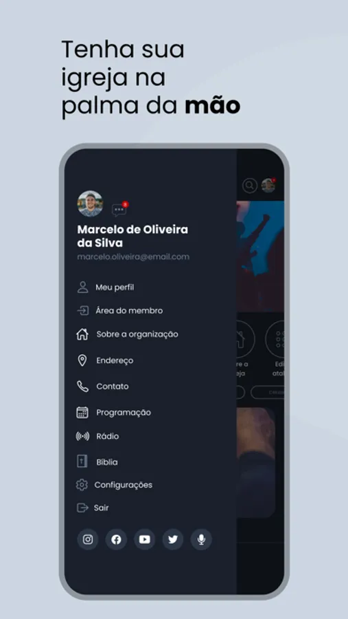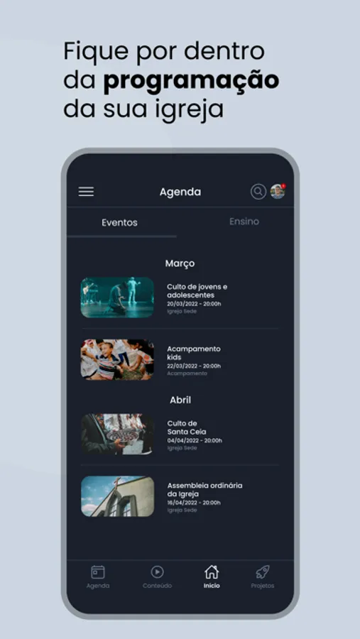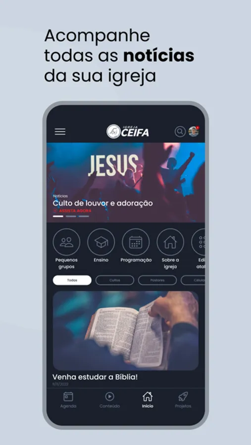 Recursos disponíveis no Aplicativo: Notícias, Agenda da igreja, Eventos, Conteúdos, Projetos, Transmissão ao Vivo e Módulo Ensino.
