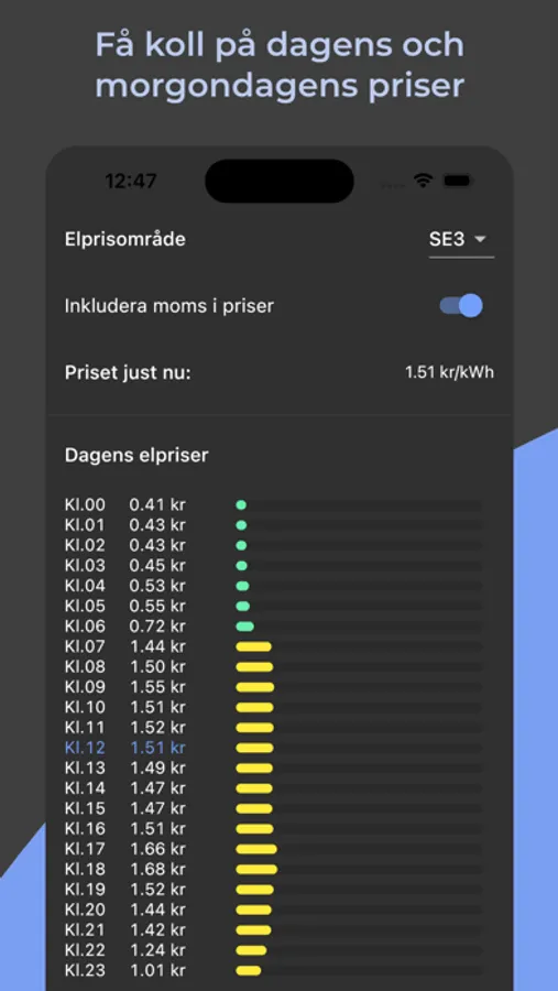 Elarm är en app där du kan se dagens och morgondagens elpriser, se elkostnader för dina prylar samt välja att få notifikationer till din mobiltelefon vid höga elpriser. Du väljer själv vid vilket elpris du vill få en varning i form av notifikation.