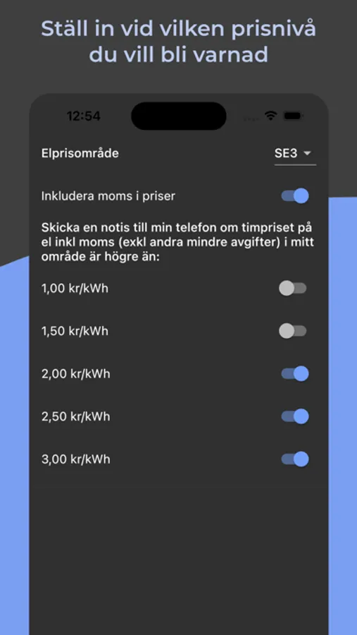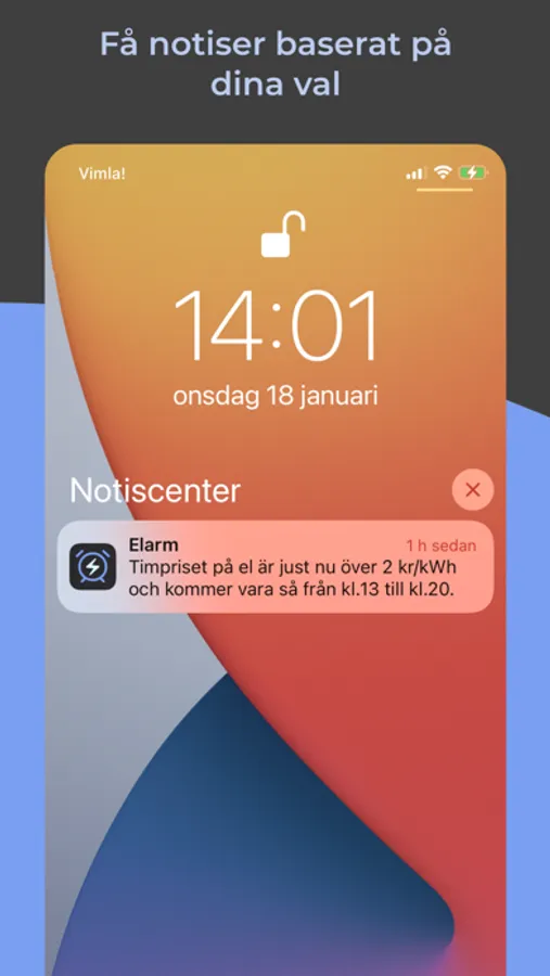 Notifikationen ger dig information om hur länge elpriset kommer vara över den valda nivån, exempelvis "Timpriset på el är just nu över 1kr/kWh och kommer att vara så från kl 13 till kl 21."