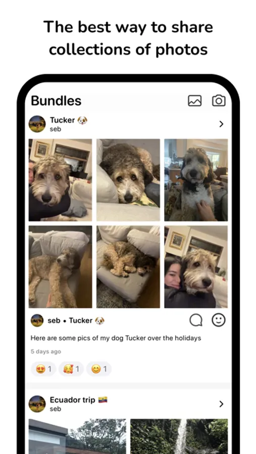 Bundle is a photo-sharing app where users create and share photo albums (called Bundles) based on topics and events for their friends to see. For each Bundle you create, you can choose who can view that Bundle. Viewers can see, comment, and react to your posts. You can also share links to your Bundles, so your friends without the app can still see them!