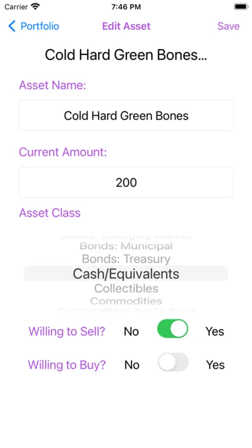 Sometimes you may already hold assets that you aren't currently willing to buy or sell, such as for tax reasons. Marking those assets as unwilling to buy or sell will remove them from the buy and/or sell calculations when rebalancing.