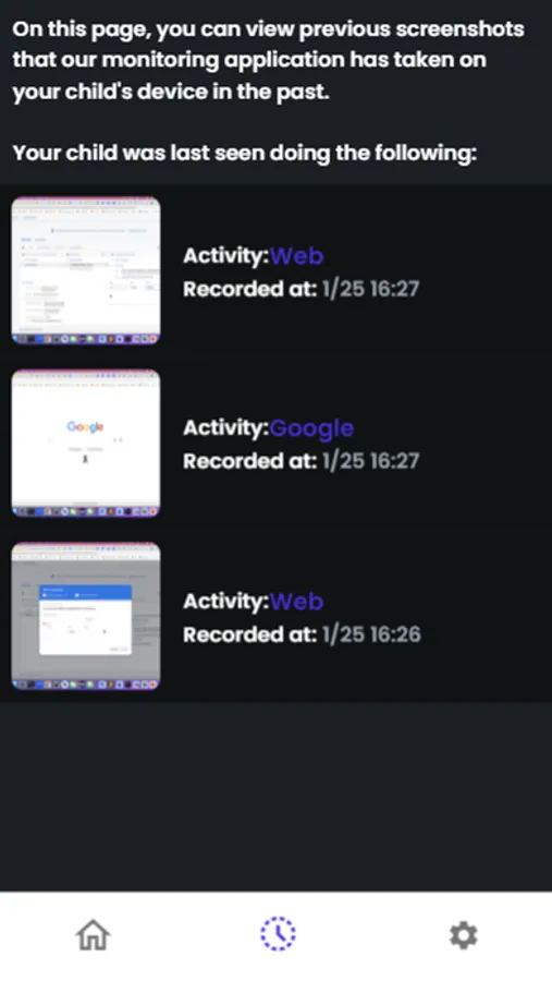 Linkvance is an AI-based parental control application to help you monitor your child's device usage with greater efficiency and more transparency. With this application, you can see recent activity from your child on devices with the accompanying desktop application. See what your child was last seen doing with a timestamp and a screenshot. Our AI recognition software will also let you know what it recognizes, whether your child is playing a video game or surfing the web, so that you're always in the loop. You can also view a history tab to see the recent activity going on with your child and see previous timestamps in the system.