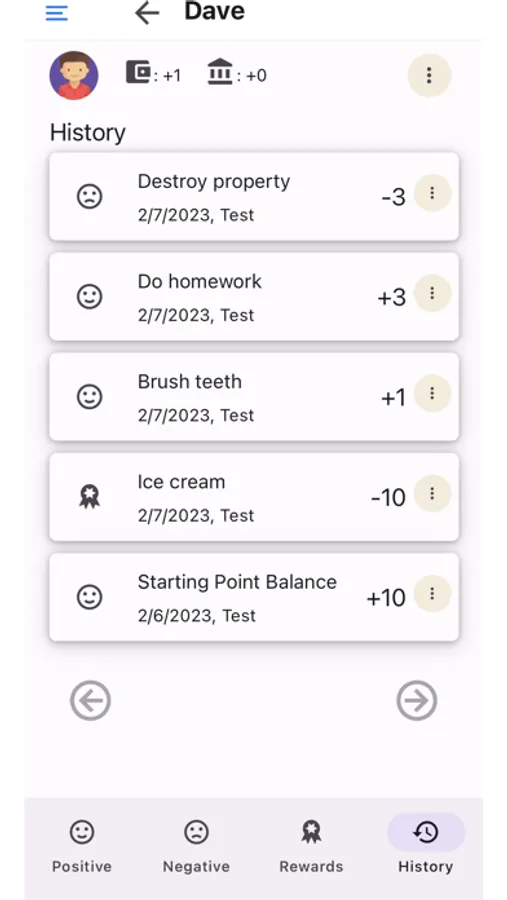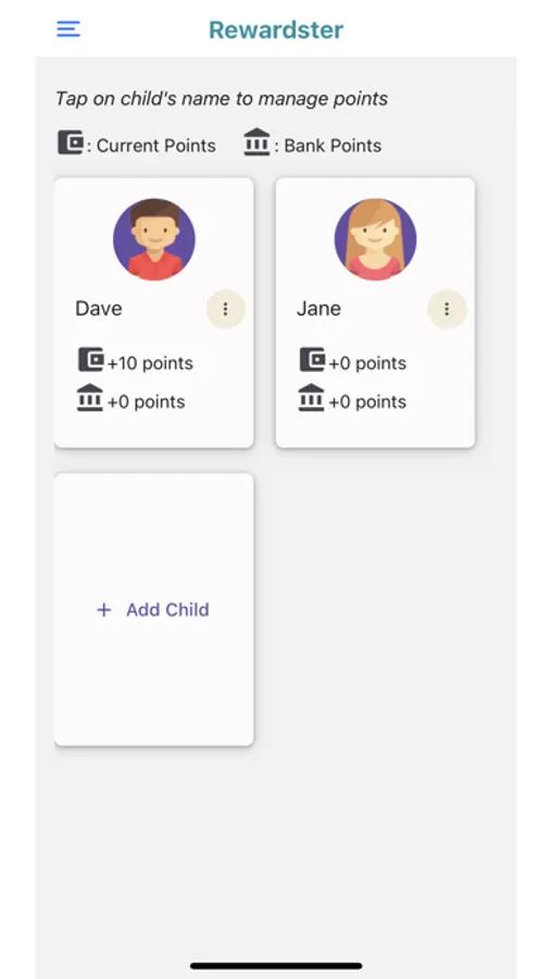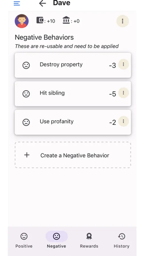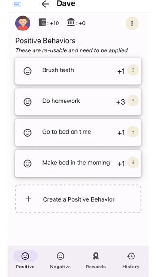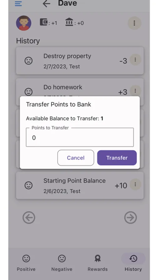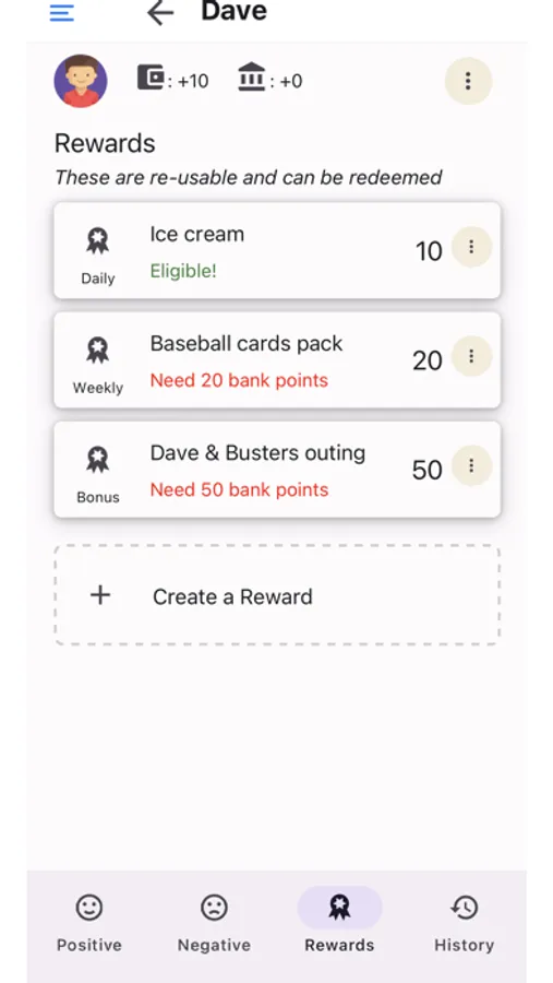Accumulate points for your child by creating and tracking positive and negative behaviors. Redeem points for rewards. Transfer points into a bank to redeem for higher value rewards.