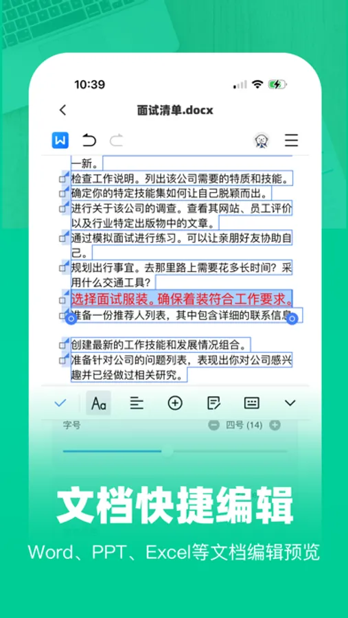 移动办公软件支持doc, dot, wps, wpt, docx等文件的预览以及编辑,自由创作文档内容;