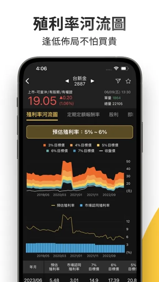 運用預估殖利率畫出位階河流圖,看出股價與預估殖利率關係,找出個股便宜價。