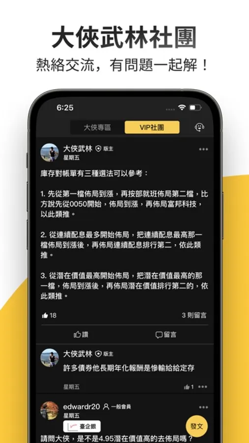 收藏大俠教學內容,透過內容專區提供存股紀律心法;透過社團區幫學員解惑。