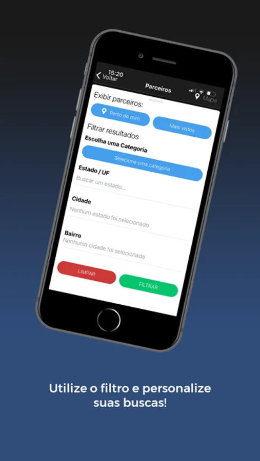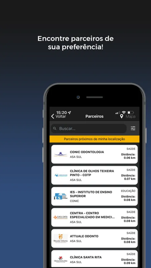 Busca de parceiros através do geolocalizador, filtragem personalizada para as buscas de empresas parceiras, acesso ao cartão virtual para utilizar os descontos, acesso a notícias e além do SAC para atendimento.
