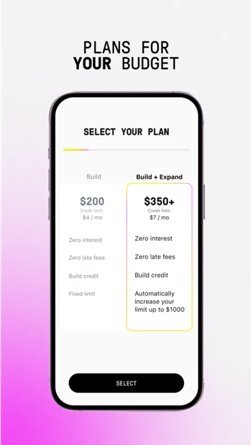 This plan is great for first time card holders who want more spending power. It’s $7/month. You start with a credit limit of $350-$500 that can increase up to $1000 over time with good financial habits. Simple.
