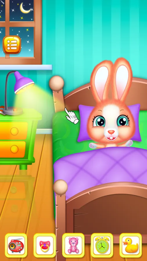 Sleeping - Bunny is very tired so try to play some music so he can go on bed for sleep. Put baby on bed for sleep and control the lights so he can sleep well.