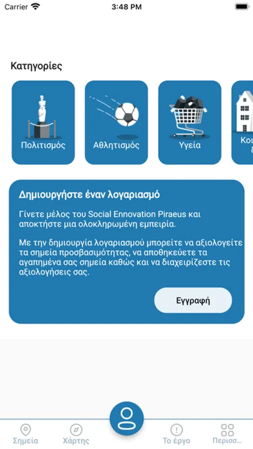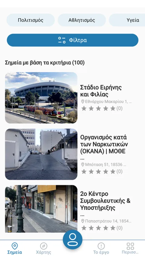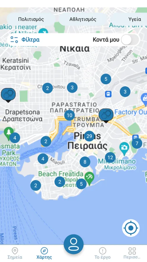 This application essentially works as a map of accessible points for the disabled in Piraeus. It includes points of cultural and sporting interest (such as museums, theaters, stadiums, swimming pools, gyms, seatrac, etc.), points of social support and structures (such as social structures, etc.), points of accessibility to businesses (such as cafes, restaurants, retail or wholesale stores, etc.) , and points of tourist interest (such as museums, parks, hotels, etc.).