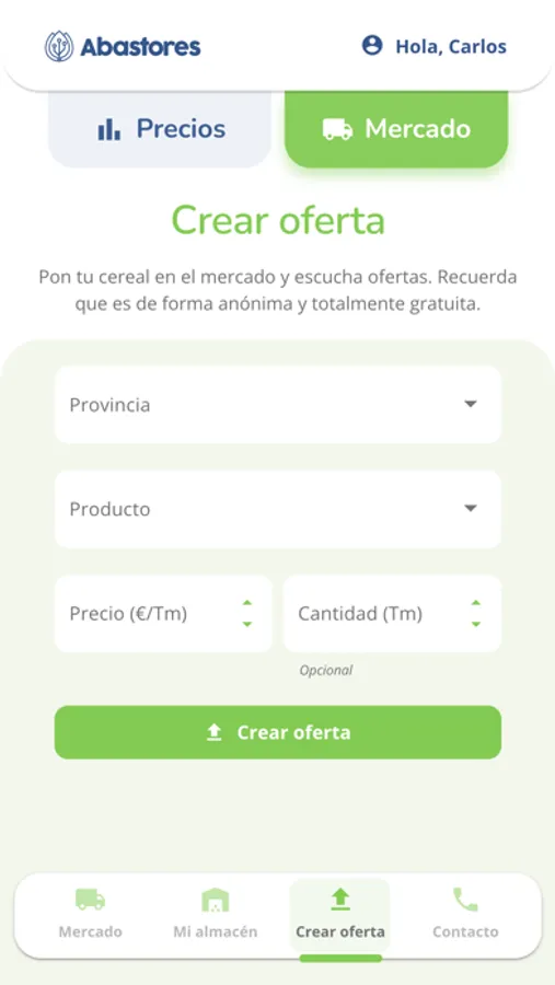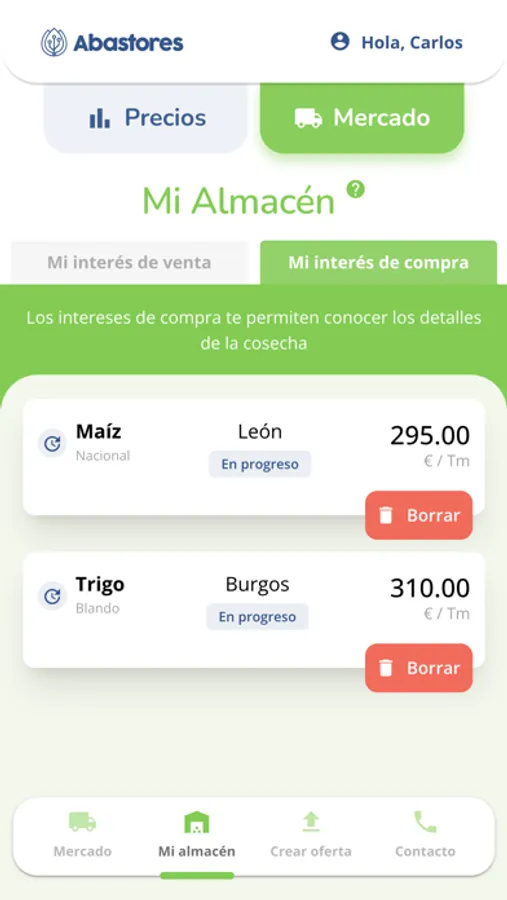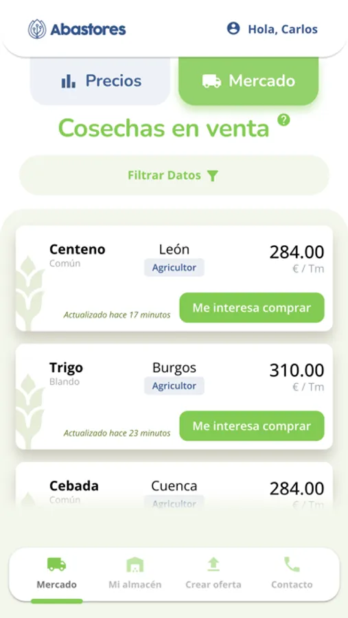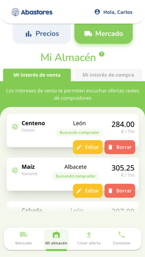 Una vez el agricultor tenga interés en una oferta, Abastores pone en contacto directo al agricultor con el operador de mercado SIN COSTE alguno para el agricultor ya habiendo negociado los términos de pago, cantidad, calidad y periodos de despacho correspondientes a la operación.
