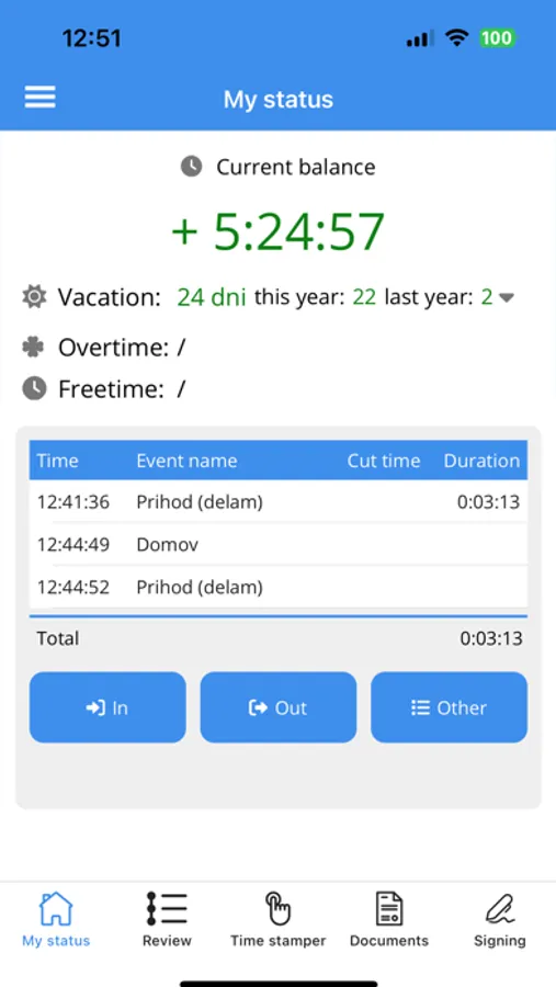 Up-to-date insight into data, number of hours, leave balance, schedule, daily regime.