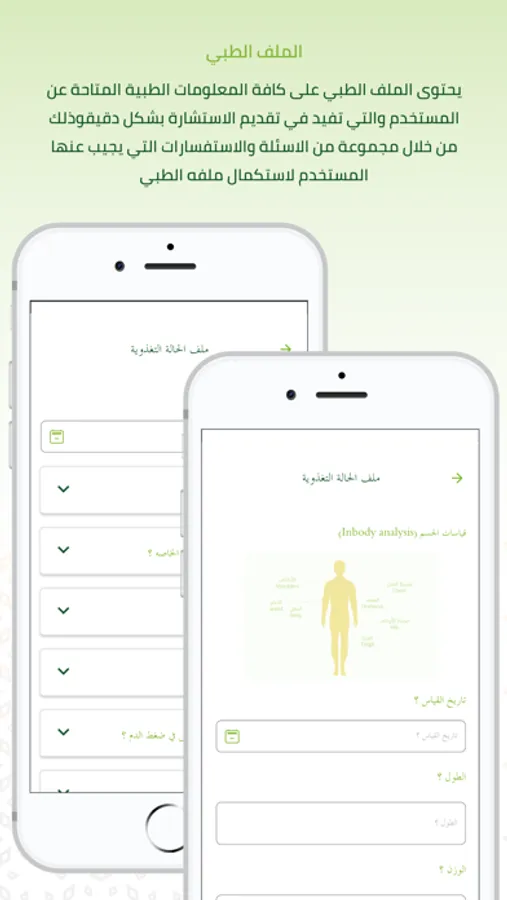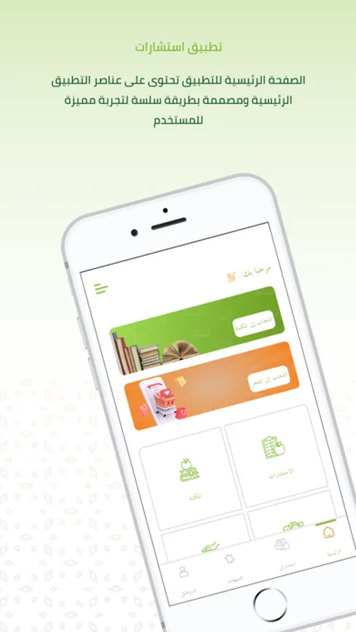 ويحتوى التطبيق على مجموعة من العناصر المهمة مثل (المكتبة - المتجر الالكتروني - الملف الطبي - نموذج طلب الاستشارة).