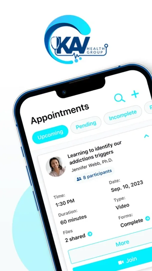 KAV Health Group, telemedicine substance abuse and mental health treatment. Full medical and clinical services utilizing telemedicine allowing private and discreet treatment for substance use disorder and mental health. Treatment from the comfort of home, on the go or at the office using evidence based treatments. Book Counseling, medical and therapy appointments, fill out paperwork or use the patient portal through the app. Group counseling, individual therapy and medical appointments with licensed and trained professionals at your fingertips.