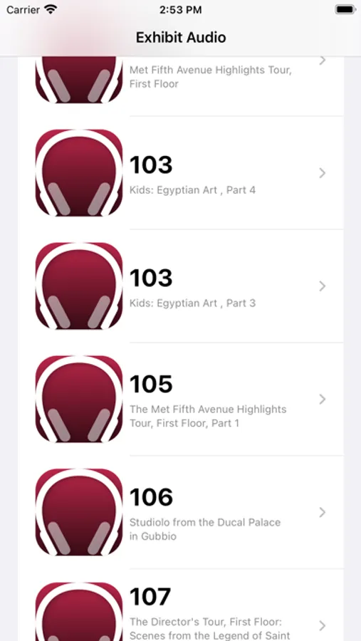 Met exhibits with audio have numbers next to them that correspond with the app audio guide. Easily scroll through all the exhibits listed in order by number, find your audio guide and select.