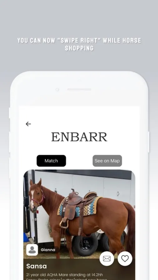 Enbarr provides app users a platform to buy and sell horses at their fingertips. The app allows buyers to view horses that are listed for sale, customize search criteria, like and save horse profiles in their favorites tab, and contact sellers.