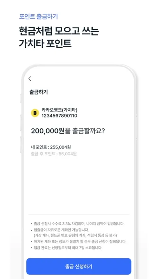 · 현금과 같은 가치타 포인트는 ‘출금하기’로 돌려받을 수 있어요.