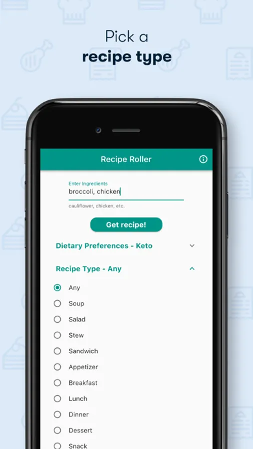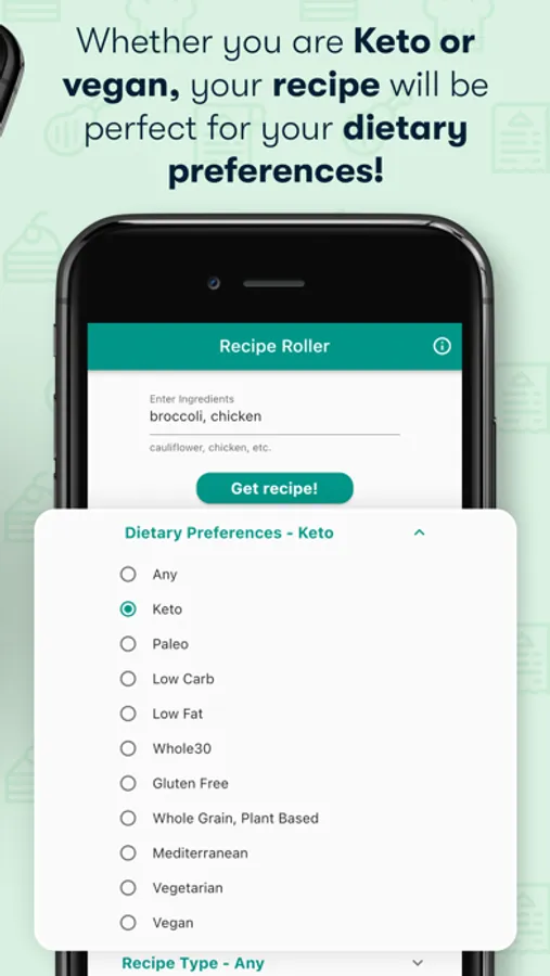 Simply enter the ingredients you have on hand and let revolutionary GPT AI technology do the rest. Our app will generate a custom recipe using your ingredients and dietary preferences! Customize your recipe further with recipe type, cuisine and preferred kitchen equipment. No more wasted ingredients or boring meals. No more slogging through tons of Internet search results and scrolling through endless ads to get to the recipe!