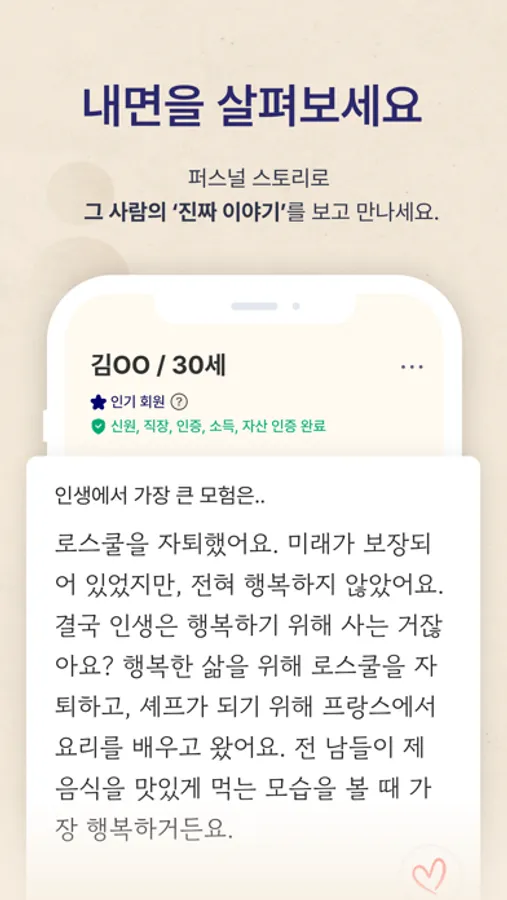 성격, 가치관, 취향 등 조건 외적인 부분을 알 수 있는 질문들이 프로필에 준비되어 있어요.