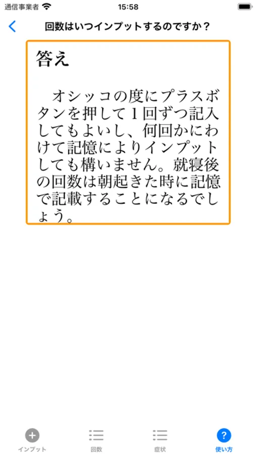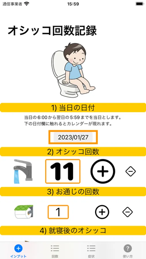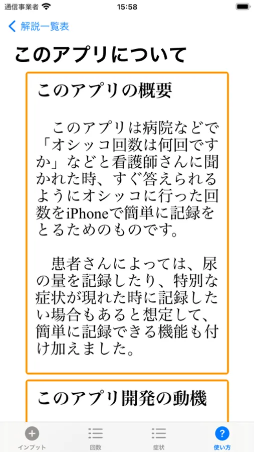 87歳のクリエーター自身が椎間板ヘルニアの手術を受けて入院生活を送った時、毎日「オシッコの回数は?」「お通じは?」と看護師さんに聞かれてこのアプリの開発を思い立ったものです。