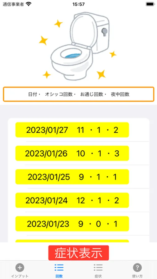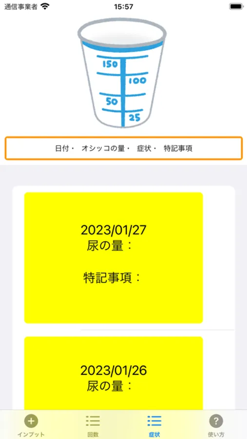 4. 頻繁に使う回数のみを日付ごとの一覧表に表示して、あまり使わないオシッコの容量、症状、特記事項は別の画面で表示するようにしています。
