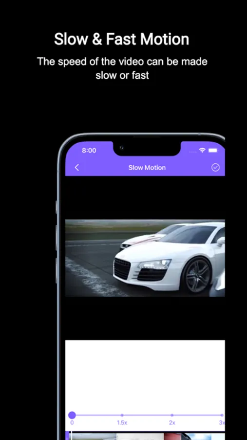 The slow & Fast Motion Video feature allows you to adjust the speed of your videos. You can apply both slow-mo & time lapse on a single video. How cool is it that you can slow down or make faster any part of a video? Slow & Fast Motion Video allows you to slow down your video at various speeds such as 1/4x, 1/2x, 1.25x, 1.5x, 2.0x, and 4.0x without sacrificing video quality.