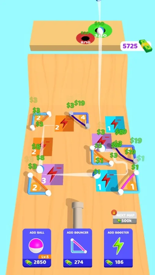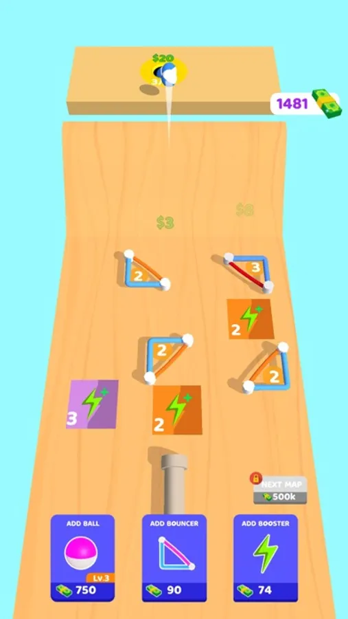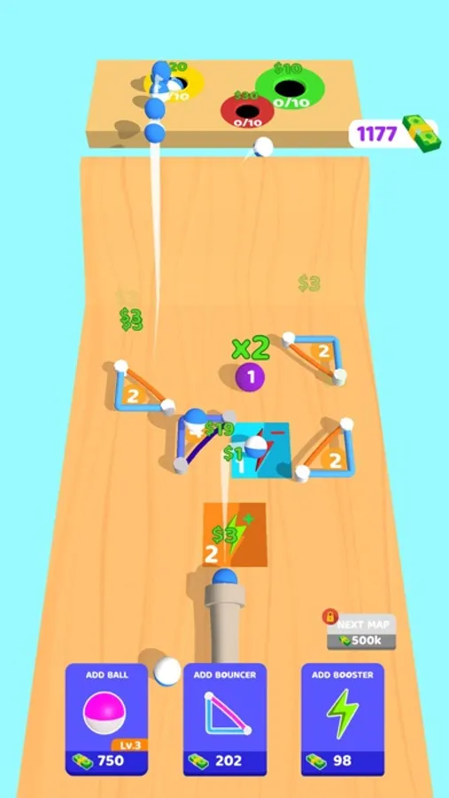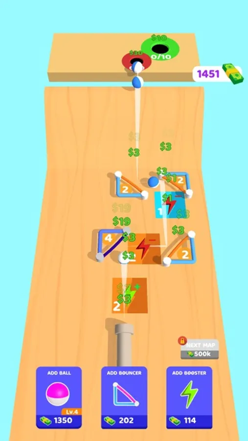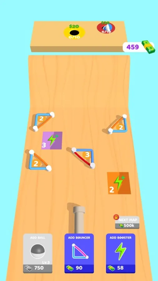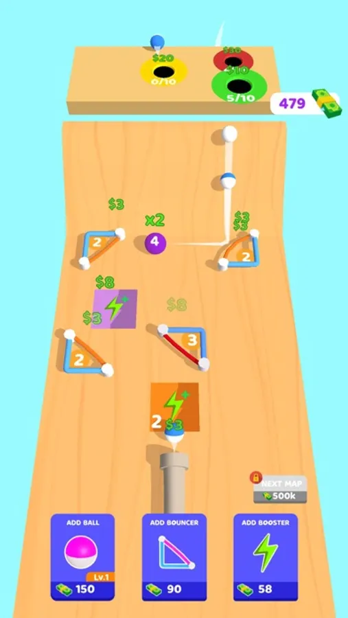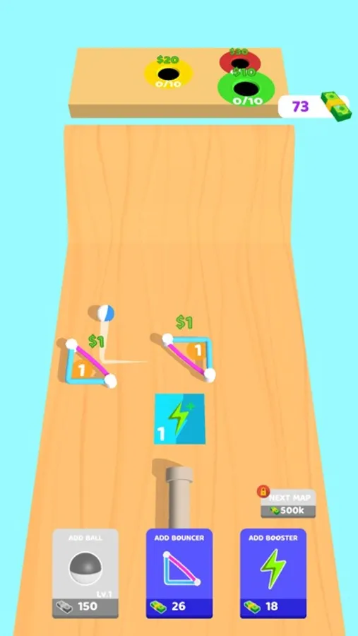 Manage your game area to steer the ball correctly! You can use bouncers and boosters as you want to direct your ball into the holes! Bouncers and boosters can be used in different ways by tapping them!