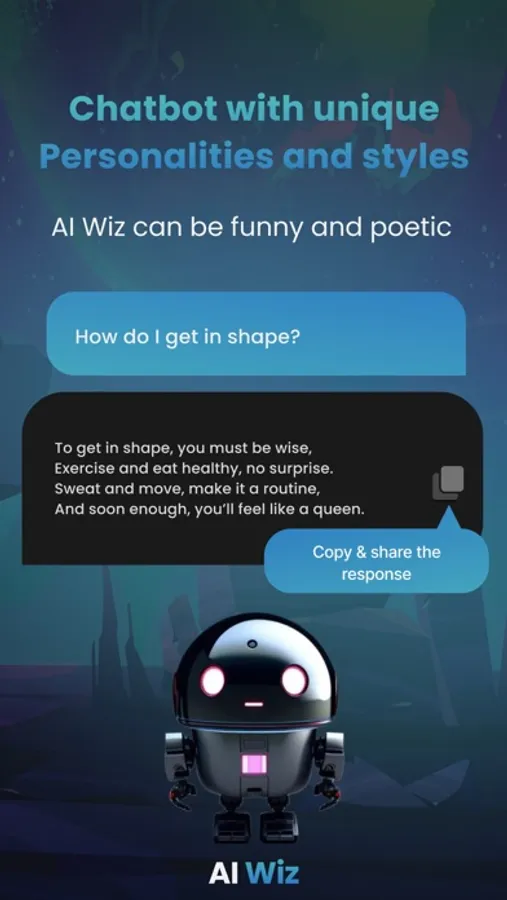 AI Wiz's friendly and conversational tone, personalized recommendations, and ability to speak in urban slang and add humor and sarcasm to your conversations make it easy to connect with others and express yourself in a fun and engaging way. Download AI Wiz today and start chatting with the most advanced AI around!