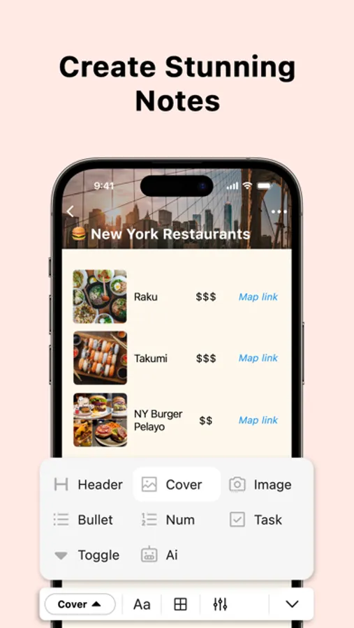 The Magic Bar brings you multiple customization options and components, enabling you to create visually stunning notes with the use of tables, images, bullets, headers, covers, and more.
