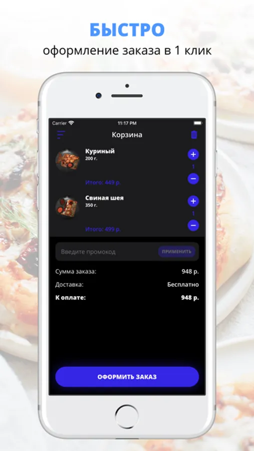 Скачивайте наше приложение, оформляйте заказ и наслаждайтесь любимой едой, где бы Вы ни были! Приятного аппетита!