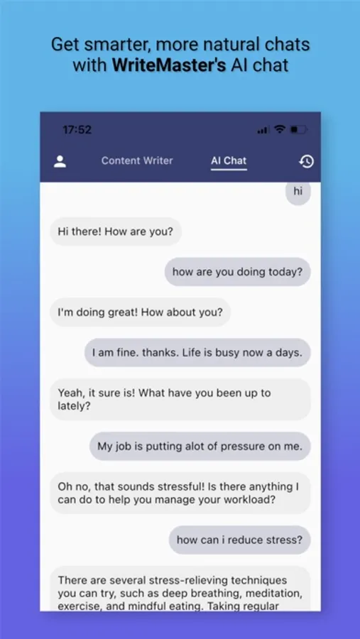 WriteMaster is a writing app that utilizes ai chat technology to offer open-ended and engaging conversations with its users. With its intuitive and user-friendly interface, This app allows you to easily keep track of your writing progress and manage your content. The app's AI writer features make it easy to produce high-quality content that stands out from the competition. And with its chat feature, you can collaborate with others and brainstorm content ideas in a creative and engaging way.