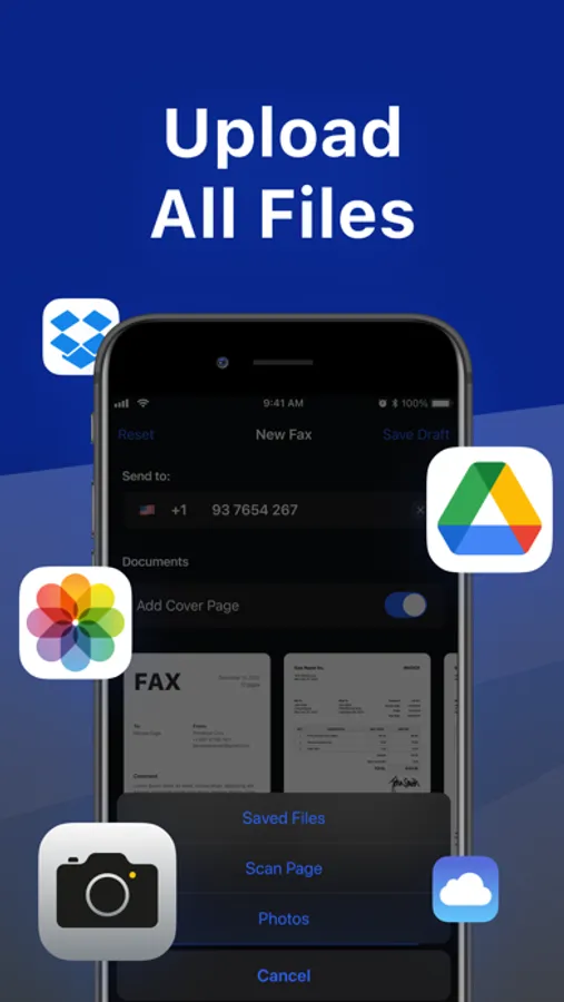 • Create faxes from your Camera Roll, Files or anywhere else