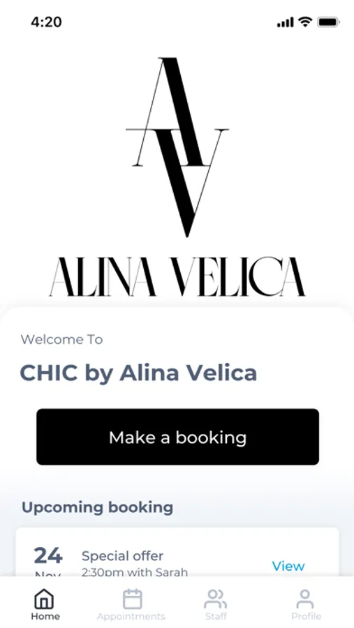 The Alina Velica app makes booking your appointments and managing your loyalty points even easier. You're just a few taps away from feeling good and looking great!