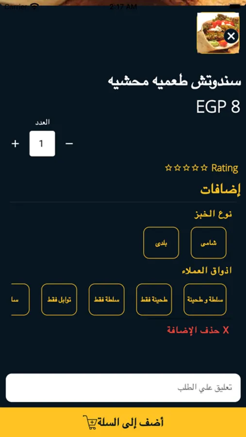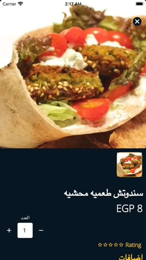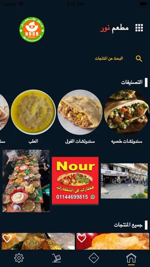 يقدم الفول البلدي المصري بطعم شهي ومميز ولذيذ وفلافل مصرية مميرة جداً كما يقدم المأكولات الشرقية المصرية مثل البطاطس باشكالها وأطعمها والبازنجان بطرقه ووصفاته والبيض بكل طرق تقديمه والجبن المختلفة وتشكيلة جميلة من الصلصات الممزوجة بالخضروات والفول والعديد من السلطات والصوصات باطعمها والوانها المختلفة مستخدماً أفضل المواد الغذائية الخام من مصادر موثوقة وآمنة وثابتة