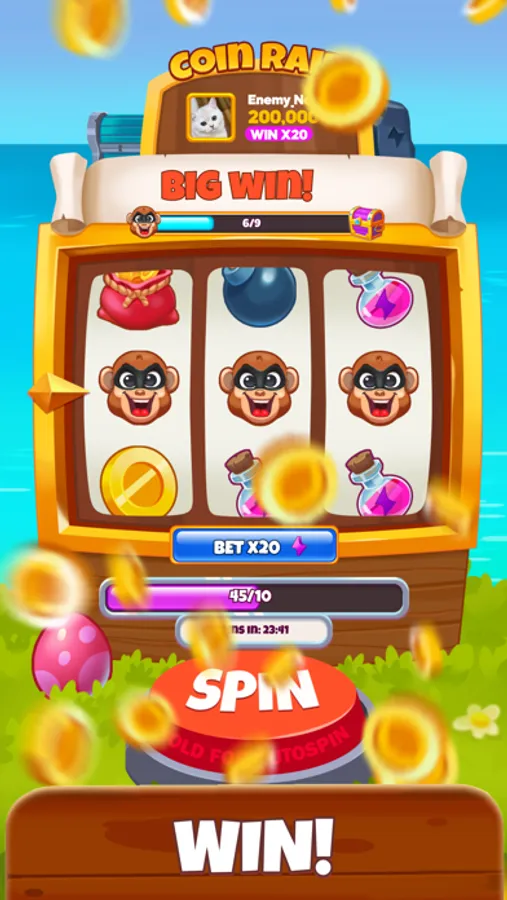 Spin the slot machine to earn coins, shields, and weapons. Use the shields to protect your village from attacks and the weapons to attack other players' villages. Raid as many villages as possible to collect as many coins as you can.