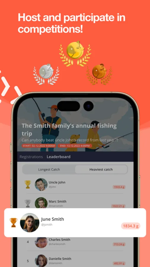 With Fishbuddy, you'll automatically be able to create and participate in a range of informal competitions and climb the leaderboards. Who has caught the biggest cod in the family, or how many species have you caught this summer? Who has the best fishing luck at work?