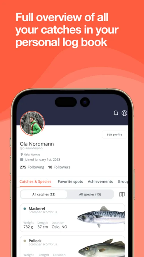 Using advanced camera technology and our own team of AR and AI developers, we've created the world's best fish recognition feature. By including AR, we can accurately measure length and provide an estimate of weight. This gives you quick and easy information, and if you share it with us, it will contribute to the management of SDG 14: Life below water.