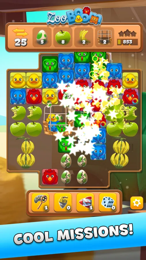 The further you progress, the more tricky the challenges will get: free animals from cages which are too tiny, destroy boxes and remove poisonous mushrooms - there's always stuff to do in your zoo! In case you are stuck and can't complete the needed tasks, simply buy additional boosters in the shop and use them in the level. Can you earn all stars in Zoo Boom?