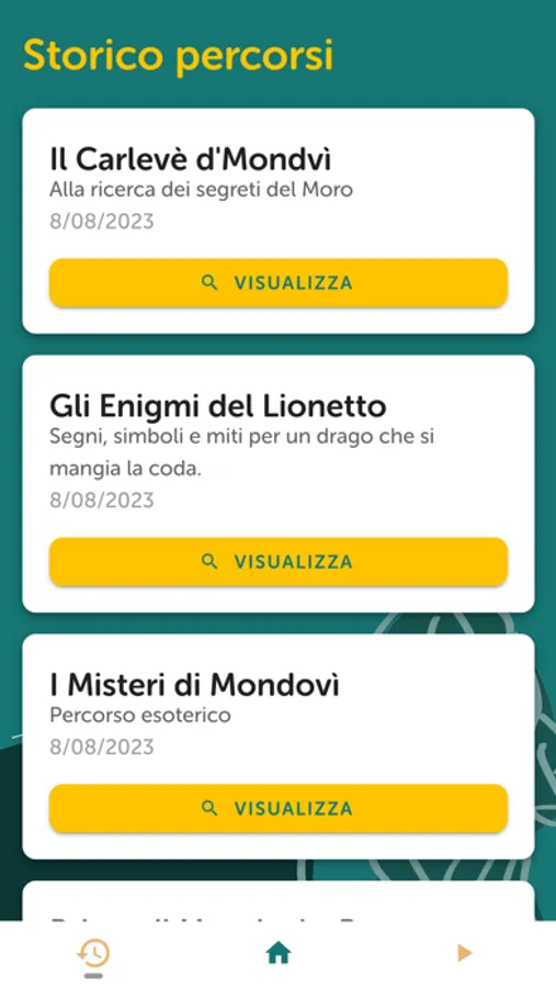 Sulla medesima applicazione ci saranno percorsi di gioco fissi e altri temporanei che si svolgeranno in posti diversi. Ogni percorso sarà firmato da un autore e avrà uno specifico genere. I primi tre percorsi di gioco sono: percorso temporaneo a Mondovì “il Carlevè d’Mondvì”, firmato da Marco Tomatis e dedicato alla maschera del carnevale monregalese; percorso fisso “I Misteri di Mondovì”, firmato da Lorenzo Barberis e dedicato agli aspetti esoterici; percorso fisso a Londra “I luoghi dei film di Harry Potter”, firmato da Francesco Ponzo.