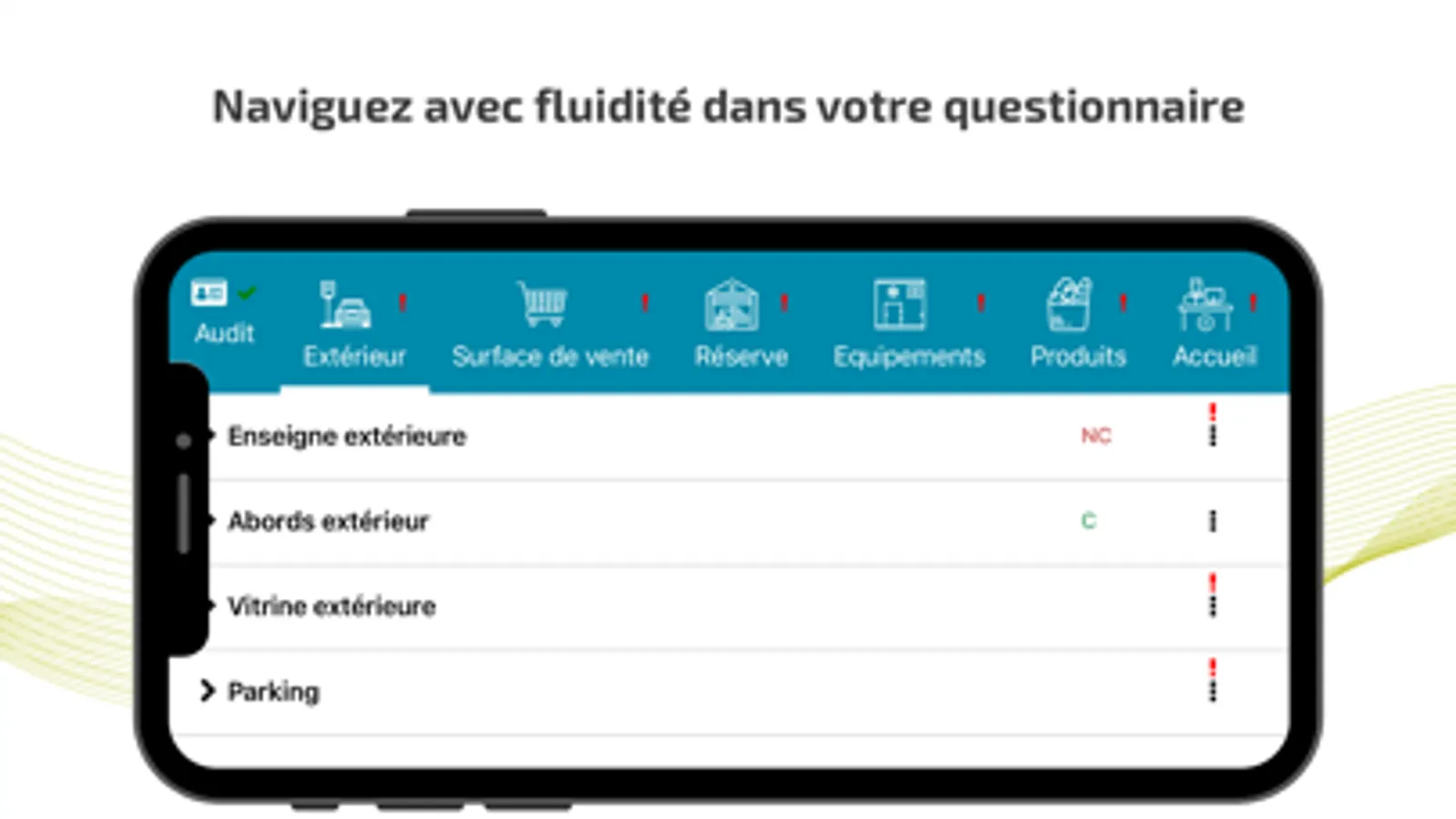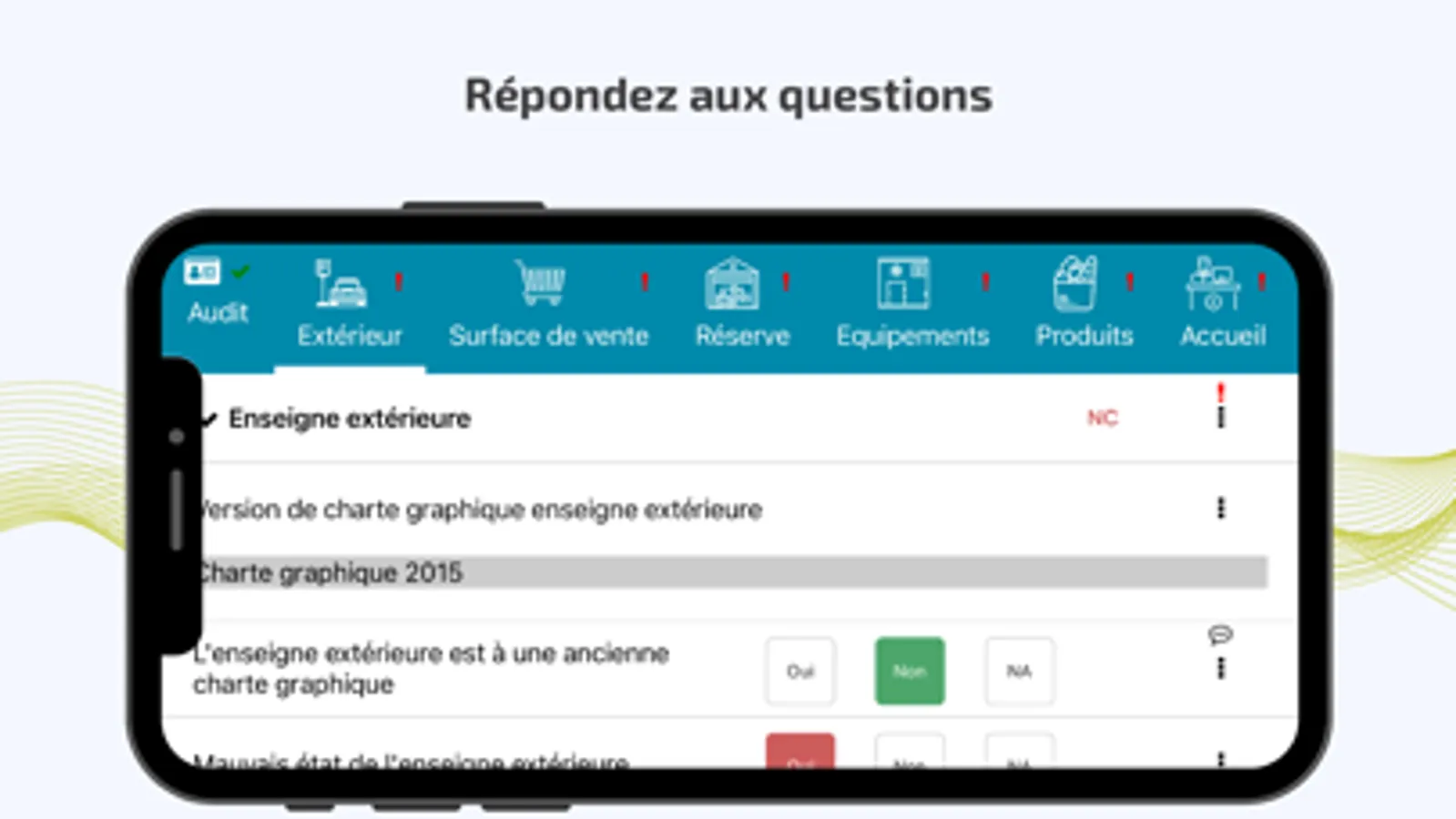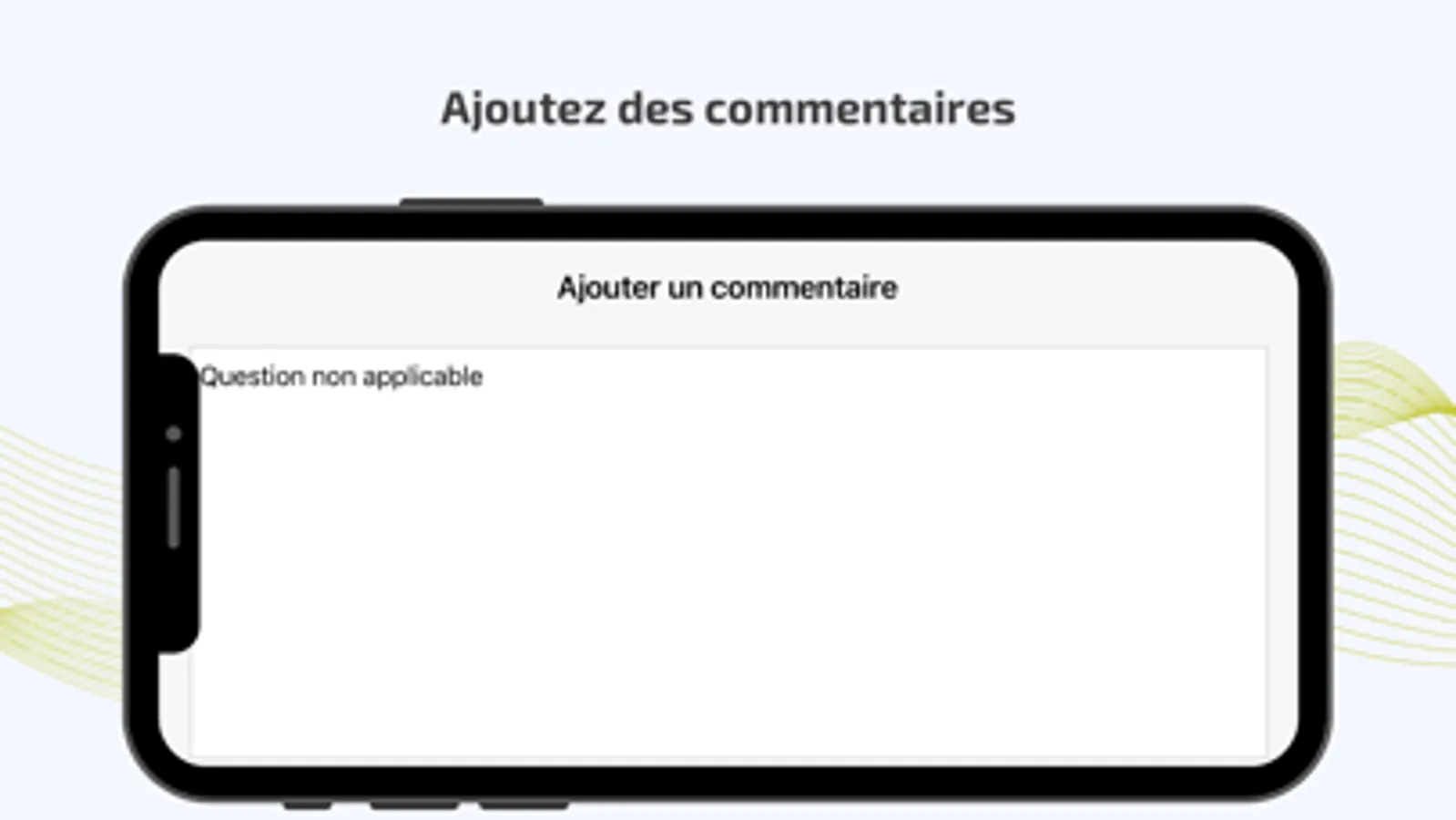 Notre solution vous permet à l’aide d’une application mobile, de répondre à des questionnaires basés sur des référentiels normatifs ou personnalisés, incluant des barèmes d’évaluation sur mesure, du scoring, des délais, des états, des commentaires, et des photos.