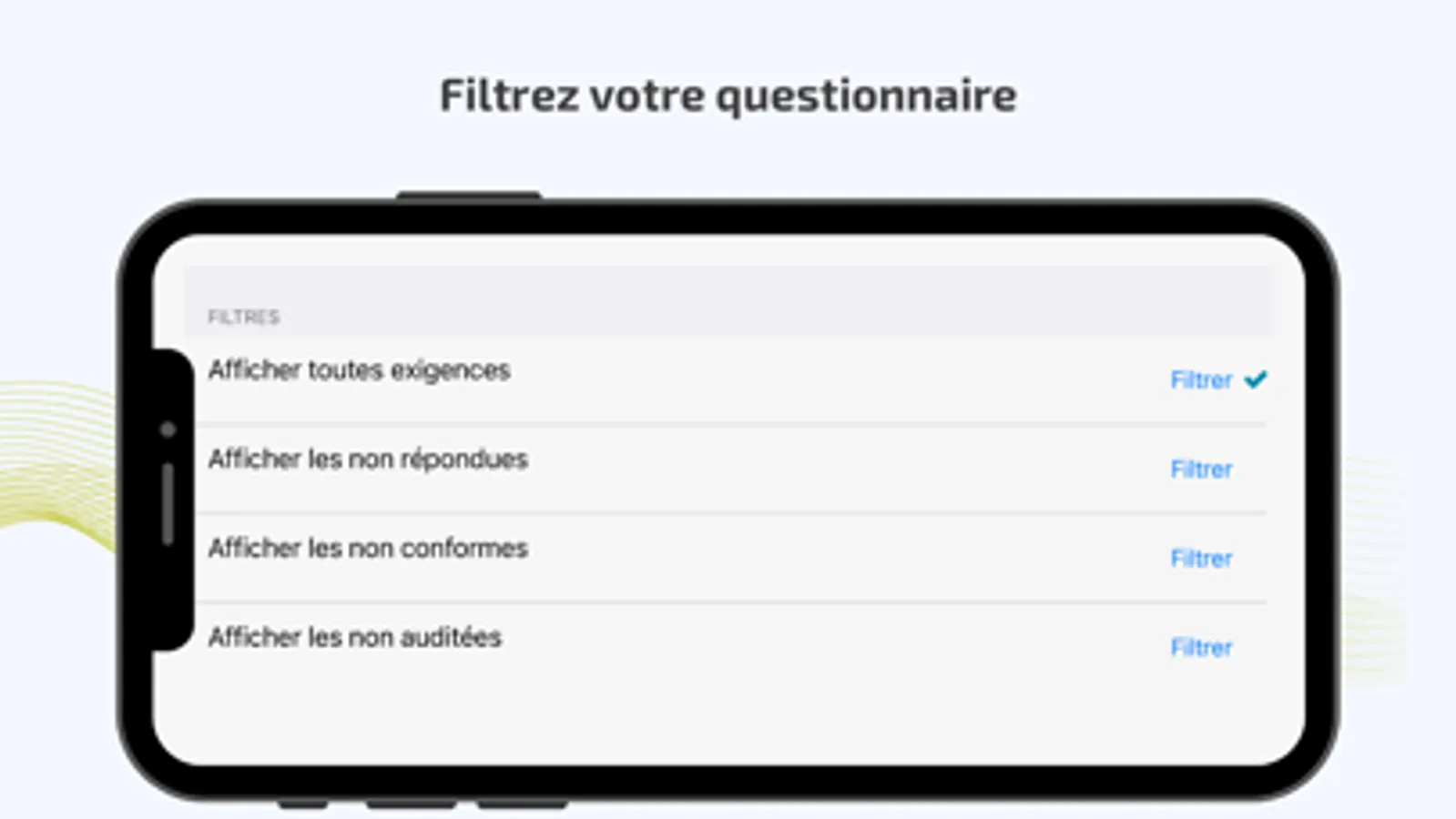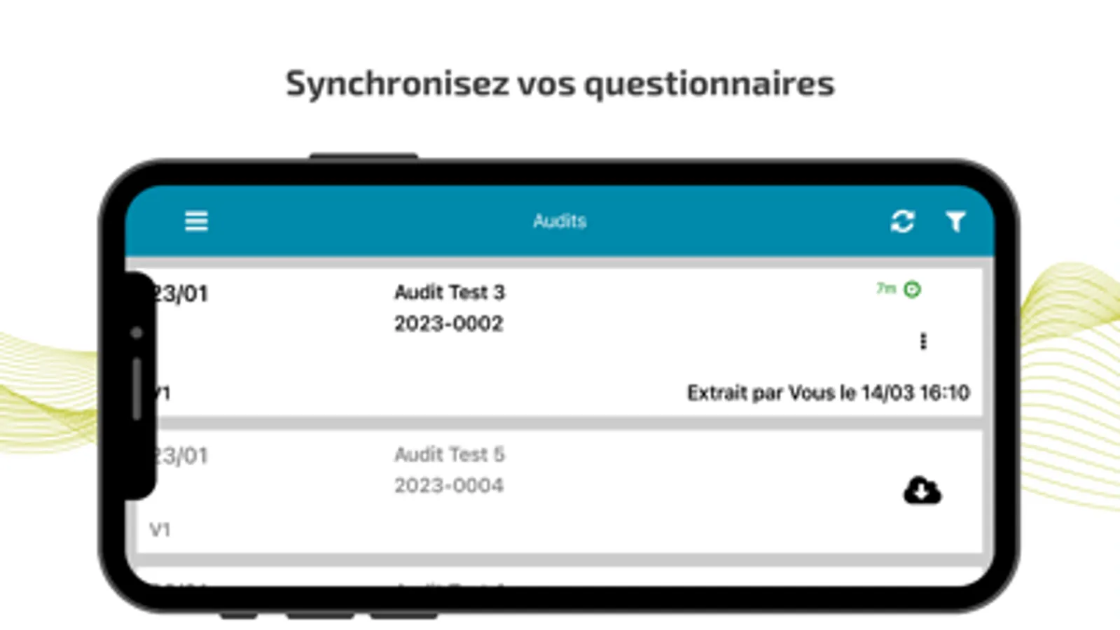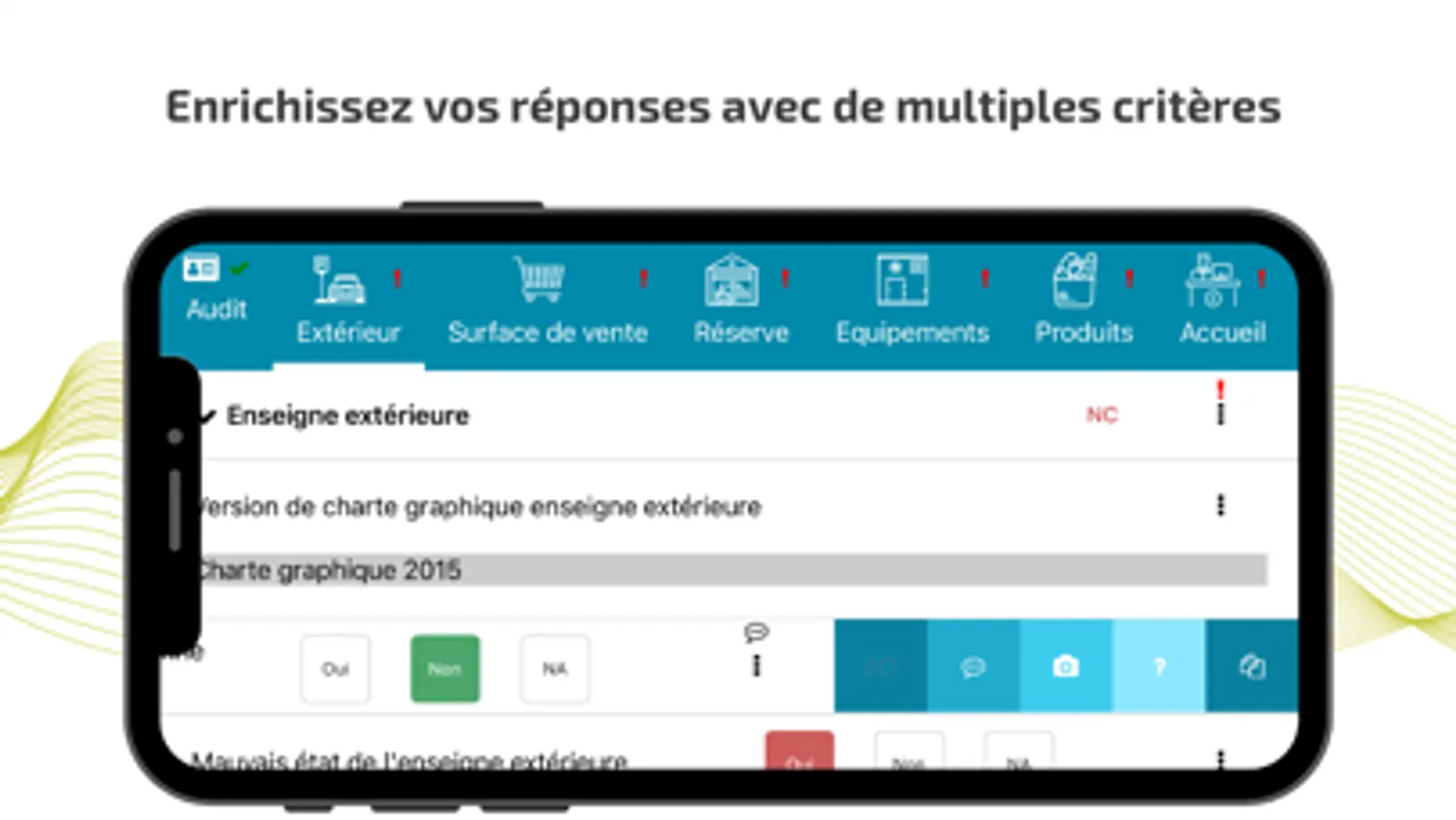 Notre solution vous permet à l’aide d’une application mobile, de répondre à des questionnaires basés sur des référentiels normatifs ou personnalisés, incluant des barèmes d’évaluation sur mesure, du scoring, des délais, des états, des commentaires, et des photos.