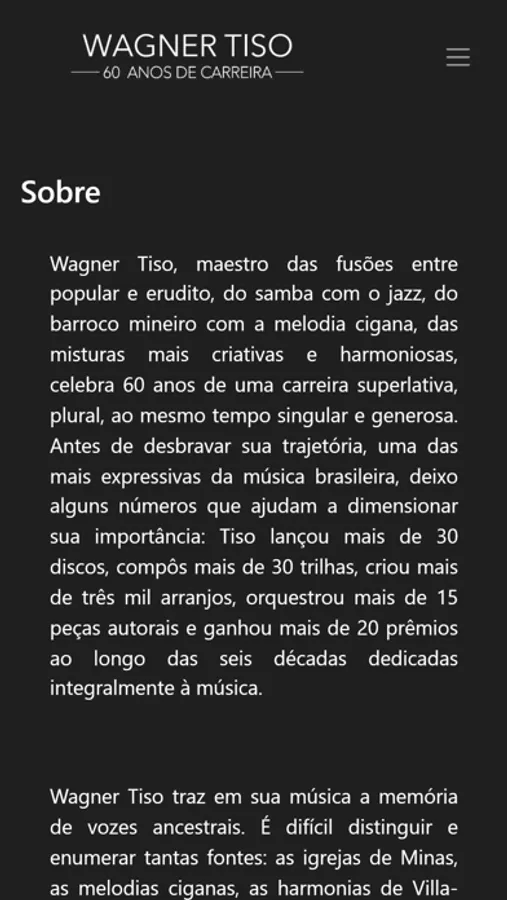Wagner Tiso, maestro das fusões entre popular e erudito, do samba com o jazz, do barroco mineiro com a melodia cigana, das misturas mais criativas e harmoniosas, celebra 60 anos de uma carreira superlativa, plural, ao mesmo tempo singular e generosa. Antes de desbravar sua trajetória, uma das mais expressivas da música brasileira, deixo alguns números que ajudam a dimensionar sua importância: Tiso lançou mais de 30 discos, compôs mais de 30 trilhas, criou mais de três mil arranjos, orquestrou mais de 15 peças autorais e ganhou mais de 20 prêmios ao longo das seis décadas dedicadas integralmente à música.