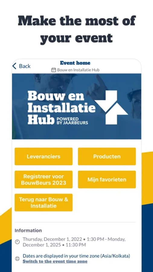Installation and construction are increasingly moving towards each other. With the Bouw en Installatie Hub we bring news and product news from the two branches every day. With this app you can prepare your exhibition visit and get in touch with exhibitors, partners, speakers and visitors. You will also find your ticket here.