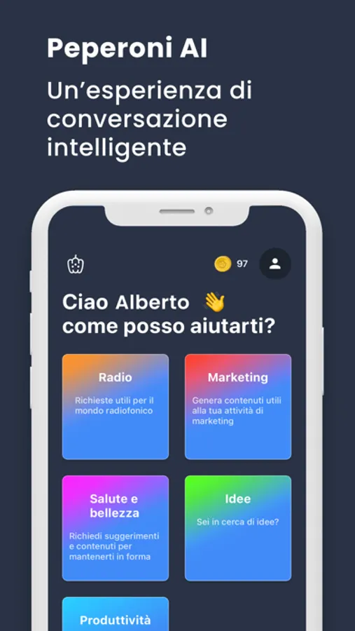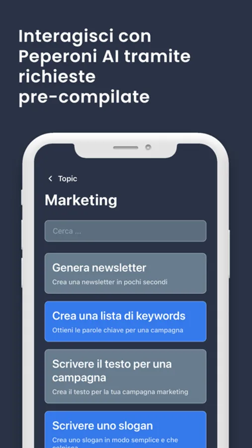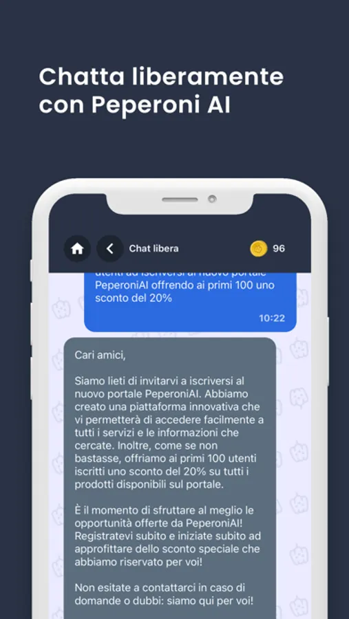 Con Peperoni AI potrai ottenere informazioni, consigli e risposte a qualsiasi domanda. Puoi utilizzare i suggerimenti pre-compilati per avere già un'idea di cosa domandare e di come chiederlo, oppure puoi utilizzare la chat libera per formulare le tue domande in modo naturale, come se stessi semplicemente chattando con un amico.Risposte dettagliate e articolate per scrivere testi, rispondere a email, farsi ispirare, ideare viaggi e hobby, riassumere testi, pianificare azioni o ricevere spunti creativi.
