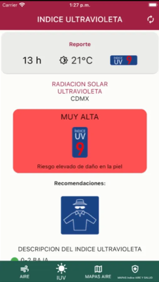 Información de la intensidad de la radiación solar ultravioleta y tiempo meteorológico en la Ciudad de México.