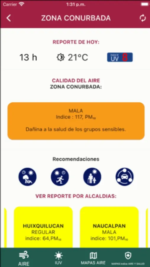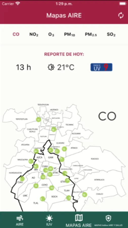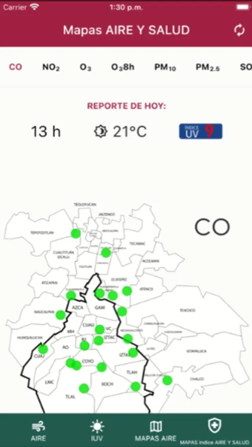 nformación horaria sobre el Índice AIRE Y SALUD para mostrar los riesgos asociados a los niveles de contaminación en la CDMX y Zona Conurbada.