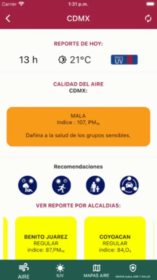 Reporte por alcaldías, reporte por municipios, mapas por contaminante y programa Hoy No Circula.