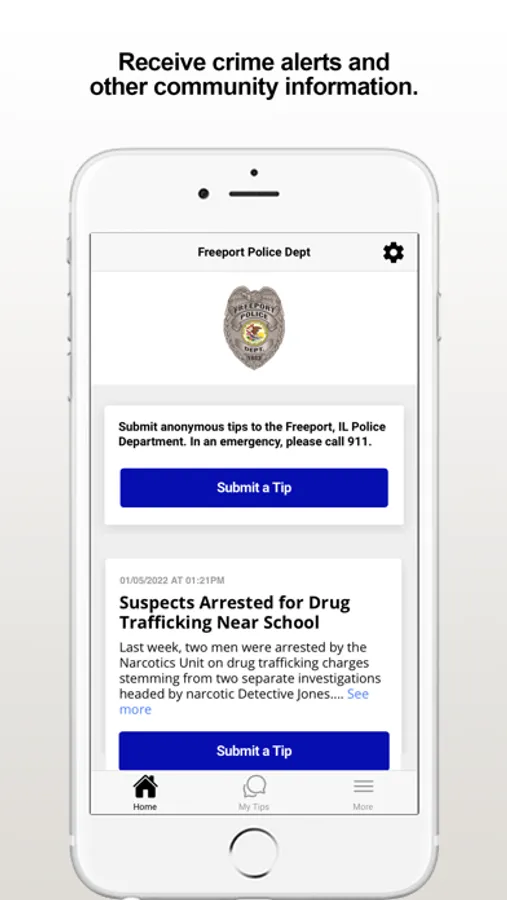 The Freeport PD app provides citizens the ability to submit anonymous tips to the Freeport, IL Police Department. The app also displays agency crime alerts and other organization web and social media content.