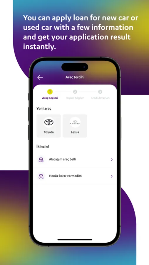- İster yeni ister ikinci el araç için kredi başvurusunu bayiye gitmeden yapabilir, kredi sonucunu anında öğrenebilirsin.